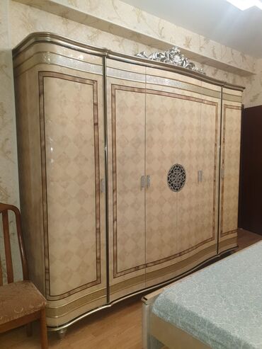 - 4 qapılı böyük qarderob (ortada dekor elementli, xrom rəngli tutacaqlar, yuxarı hissədə oyma tac)