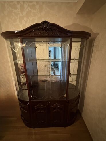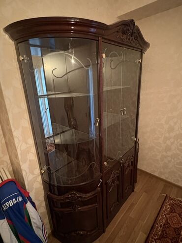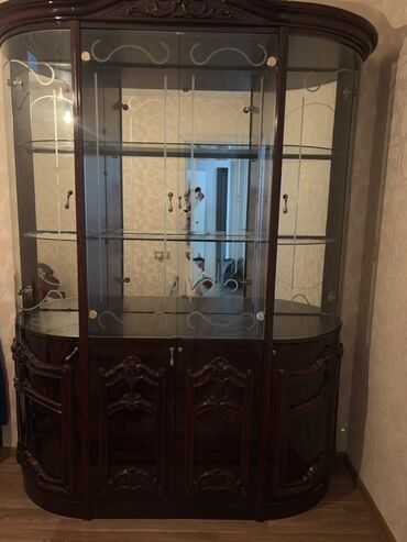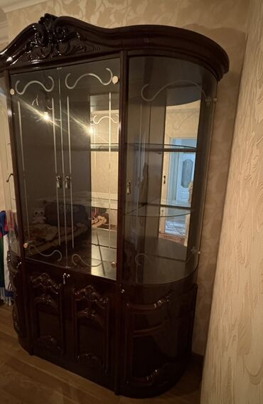 Klassik üslubda şüşəli vitrin şkaf - Material: təbii ağacdan dekorativ oyma detallarla, lak örtük - Ön və yan hissələr: şəffaf şüşə panellər – yeməkləri, bibloları və kolleksiyaları nümayiş etdirm...