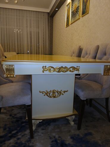 - Masa: geniş üst səth (qızılı rəngli), kənarlarda incə kontur, ortada dayanıqlı dekorativ baza, ağ-krem korpus və qızılı ornamentlər, klassik formada ayaqlar.