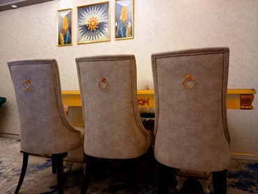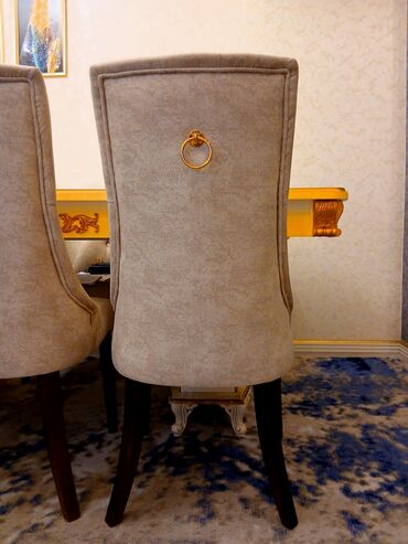 - Stullar: yumşaq parça üzlüklü (bej rəng), hündür bel hissə, arxa hissədə qızılı halqa aksesuarı, qaranlıq rəngdə taxta ayaqlar.