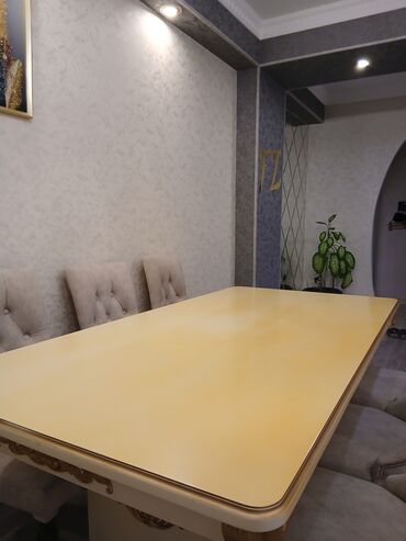 - Dəst tərkibi: düzbucaqlı yemək masası və yumşaq oturacaqlı stullar (şəkillərdə 6 stul görünür).