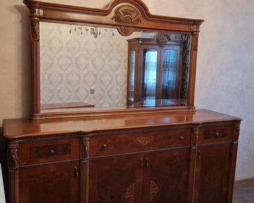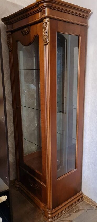 - 2 ədəd şüşəli vitrin şkafı: üç tərəfi şüşəli, içəridə şüşə rəflər, aşağıda çekmece; üst hissədə dekorativ oyma elementlər.
