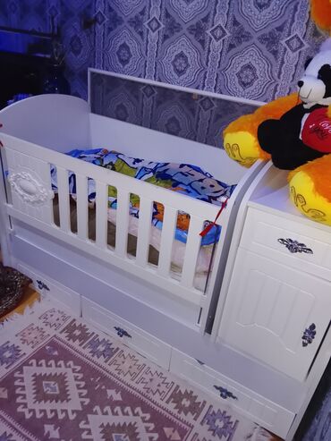 - Ölçü təxmini: standart beşik ölçüsü, yan hissədə əlavə komod/qarderob bloku