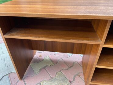 Masa – kompüter/iş masası - Material: ağac teksturasına malik laminat MDF - Rəng: qızılı qəhvəyi (albalı tonları) - Konstruksiya: iki tərəfli tumba ilə; sağda və solda qapılı bölmələr və üstündə k...