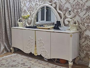 Klassik üslubda qonaq otağı mebel dəsti Dəst tərkibi: - Geniş güzgülü konsol/bufet: iki yan şkaf bölməsi, mərkəzdə iki qapılı dolab və üst hissədə çekmece. Geniş panoramik güzgü dekorativ başlıqla...