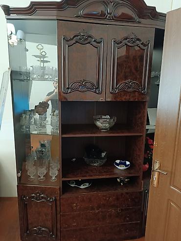 Klassik qonaq otağı mebelləri dəsti - Vitrin-bufet: Dördkapılı, üst hissəsi şüşəli vitrin bölmələri, içəridə şüşə rəflər və güzgülü arxa panel. Aşağı hissədə qapılı dolab və çekmecə bölmələri. Zən...