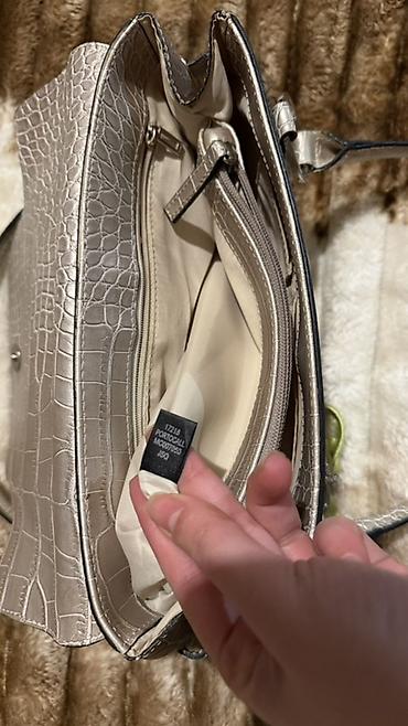 Təbii dəridən qadın çantası - Rəng: bej (nude) - Material: təbii dəri (şəkillərdə qeyd olunur) - Metal detal və furnitura: qızılı rəng - Bağlanma: üst qapaqlı, mərkəzdə fırlanan metal kilid - Daxi...