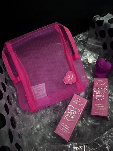 - Bənövşəyi/çəhrayı şəbəkəli kosmetik çanta, üzərində ürək formalı “Too Faced” nişanı.