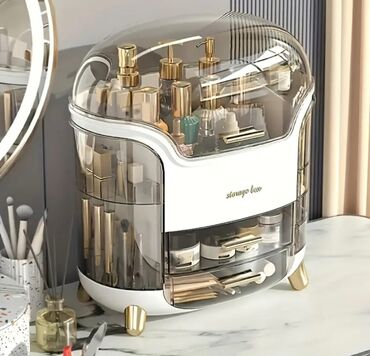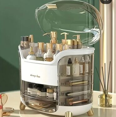 Şəffaf qapaqlı, ağ rəngli kosmetik saxlama qutusu. Bu qutu kosmetika və zərgərlik əşyaları üçün çoxlu saxlama sahəsi təklif edir. Qapaq kosmetika və digər əşyaları tozdan qoruyur. Üst hissə şampun və losyonlar kimi hündür əşyaları saxlamaq üçün uyğundur, alt siyirtmələr isə kiçik əşyaların rahat yerləşdirilməsini təmin edir. Məhsul makiyaj fırçaları, kremlər, losyonlar, ətirlər, dodaq boyaları və digər aksesuarlar kimi müxtəlif kosmetik məhsulları səliqəli şəkildə saxlamaq üçün əlverişlidir. Hamam otaqları, yataq otaqları, qonaq otaqları və qarderoblar üçün uyğundur.