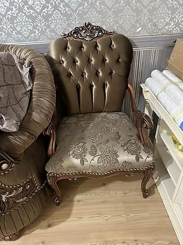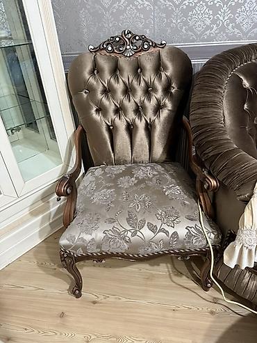 İki ədəd rahat oturacaqlı salon/kreslo dəsti. Biri 25 manat. - Dizayn: Hündür bel hissəsi, yumşaq oturacaq və taxta qol dayaqları. - Rəng: Tünd qəhvəyi parça üzlük, qəhvəyi ağac konstruksiya. - M...