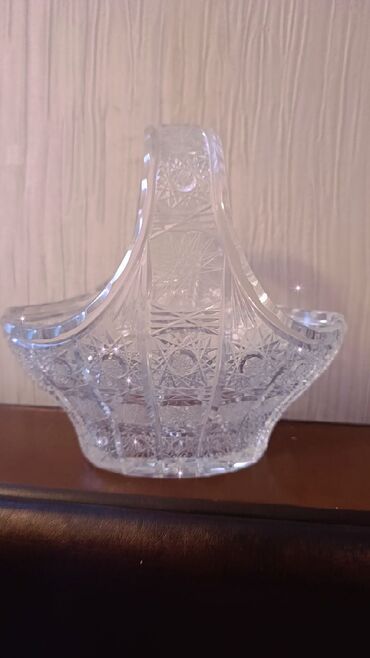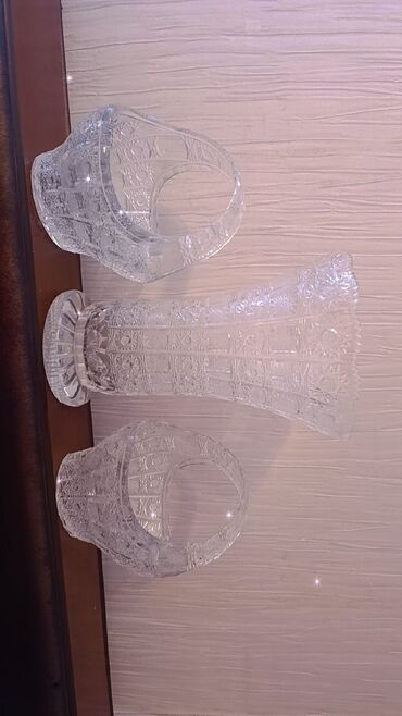 1-i 20 azndir Kəsimli şüşədən dekorativ dəst - 3 ədəd vazadan ibarət: fərqli ölçü və naxışlarda kəsimli kristal dizayn, üst kənarları dalğalı/dişli formalar. - 1 ədəd dərin meyvə/salət qabı: klass...