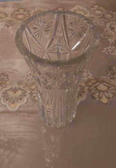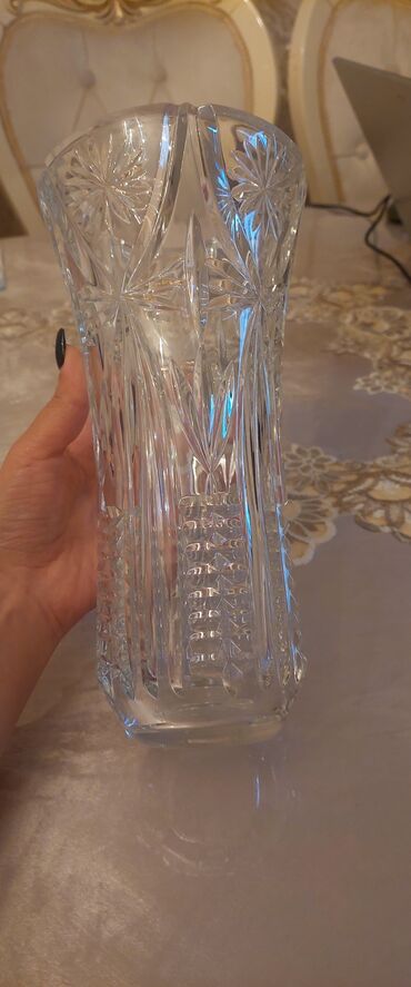 Kəsim naxışlı kristal vaza - Material: qalın, şəffaf kristal şüşə - Dizayn: əl işinə bənzər dərin kəsimlər, romb və ulduzvari ornamentlər; yuxarı hissə dalğalı kənarla - Forma: aşağıdan enli dayaq...