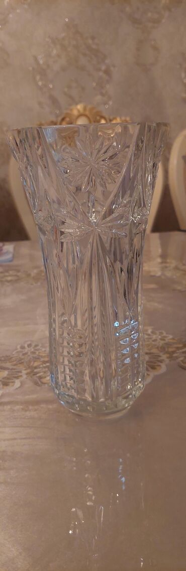 Xrustal vaz - Material: ağır xrustal şüşə - Dizayn: əl işinə bənzər dərin kəsim naxışlar (yarpaq və ulduz motivləri), işıqlı parıltı - Ağız hissə: dalğalı kənar - Ölçülər: hündürlük təxminən 30 sm...