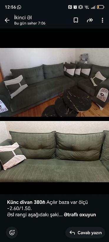 - Tünd yaşıl künc divan – ölçü 2.60/1.50 m. Açılır, baza var. Aşağıdakı şəkildə göstərilən rəng orijinal rəngidir. Arxa hissədə iri, komfortlu yastıqlar və klassik qol dayaqları.