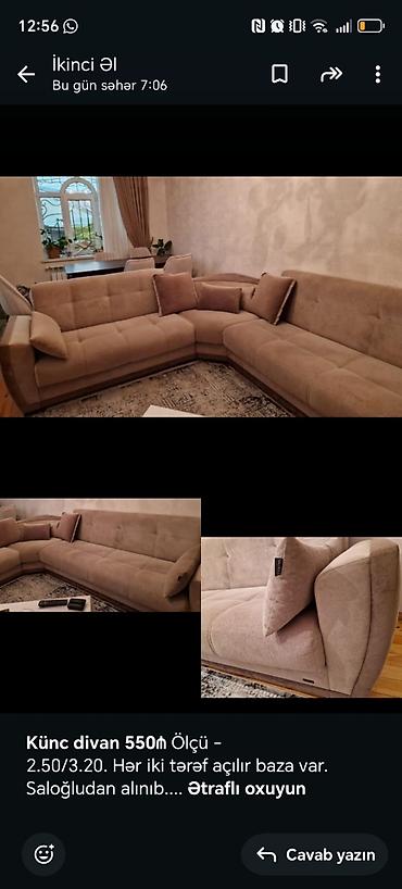 - Bej rəngli iri künc divan – ölçü 2.50/3.20 m. Hər iki tərəfi açılır, baza var. Komplektdə iri arxa yastıqlar və qol yastıqları.