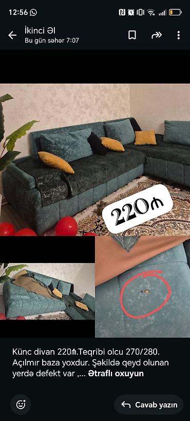 - Zümrüd-yaşıl künc divan – təxminən 270/280 sm ölçüdədir. Açılmır, baza yoxdur. Şəkildə göstərilən hissədə xırda defekt qeyd olunub.