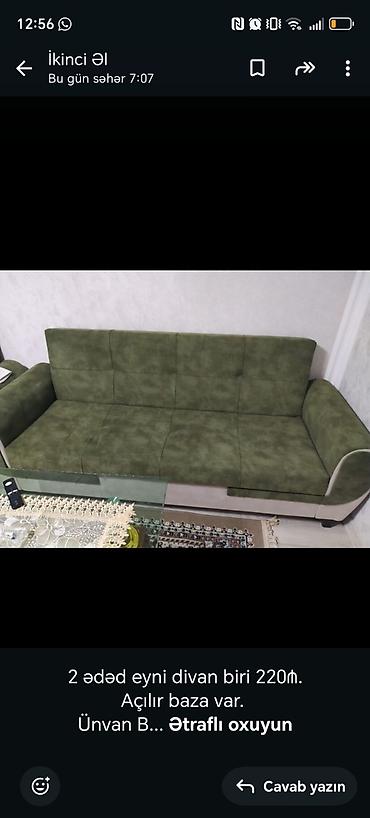 - Yaşıl rəngdə düz divan – yumşaq oturacaq və bel hissəsi, yan qolları genişdir. Açılır, baza hissəsi mövcuddur. Eyni modeldən 2 ədəd mövcuddur.