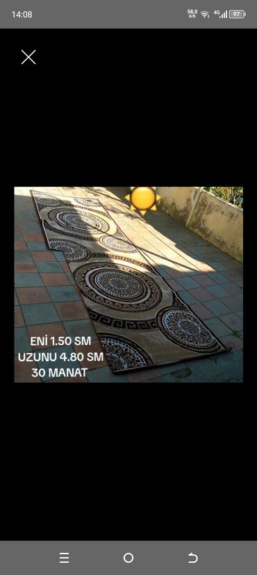Naxışlı, düzbucaqlı xalça. 3 metrə uzunu 1,5 eni. Ayaq altda çox isti olur.Yuyulub, təptəmizdir.Dəyərindən qat-qat ucuz verilir. Kolidora da işlətmək olur.Evə nostalji hisslər gətirir.