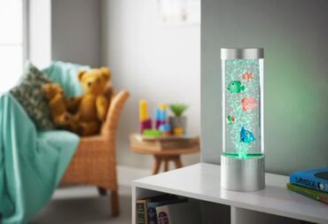 - İçəridə hərəkət edən süni balıqlar/fiqurlar və havacıqcıqlar axını ilə sakitləşdirici vizual effekt