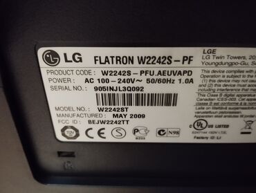 LG Flatron W1943ST monitor - Ekran: 18.5" (47 sm diaqonal), geniş format - Model: W1943ST (seriya nişanı: Flatron W1943SB-PF, Product code: W1943SB-PFT.APDNAVH) - Güc: AC 100–240V, 50/60Hz, 0.8A (...