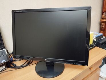 LG LCD monitor - Ekran ölçüsü: təxminən 19–22 düym (geniş format) - Mat qara korpus, parlaq dairəvi ayaq - Çərçivə alt hissəsində LG loqosu - Girişlər: arxa hissədə standart PC bağlantıları (VGA e...
