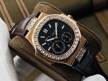 - Model 3: Patek Philippe Nautilus təqvimli versiya, qızıl korpus, baget kəsimli daşlarla bəzədilmiş bezel və bağ, qara zolaqlı siferblat, ay fazası, gün-tarix-günəş təqvimi alt-siferblatları, tünd qəhvəyi dəridən qayış.