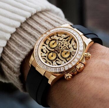- Model 4: Rolex Daytona yüksək zinət işləməsi ilə, qızıl korpus, baget daşlı bezel, skeletvari qızılı siferblat, üç xronoqraf alt-siferblatı, vintcli düymələr və qara elastomer qayış.