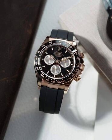 - Model 2: Rolex Cosmograph Daytona, qara siferblatlı xronoqraf, üç alt-siferblat (saniyə, 30 dəq, 12 saat sayğacları), tachymeter bezel, qızılı tonlu korpus, vintcli düymələr və qara elastomer/Oysterflex üslublu qayış.