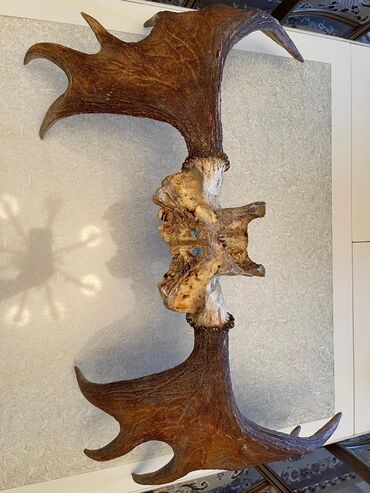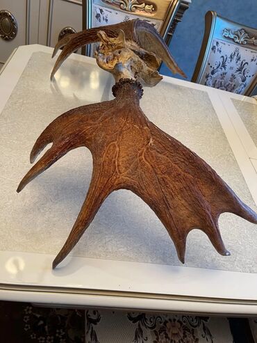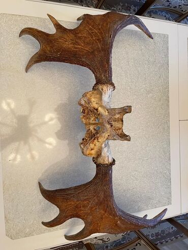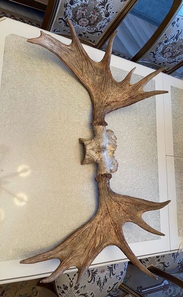 Məhsul: Divar dekoru üçün böyük maral buynuzu kompozisiyası Təsvir: - Təbii maral buynuzları, kəllə bazası ilə birlikdə - Simmetrik, çoxşaxəli quruluş: hər iki tərəfdə çoxsaylı çıxıntılar - Kütləl...