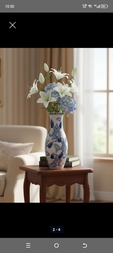 Mavi-ağ naxışlı keramika vaza - Material: keramika/porşelen - Rənglər: ağ fon üzərində kobalt-mavi rəsmlər - Dizayn: ənənəvi şərq motivləri – bulud və əjdaha/mitoloji fiqur elementləri, boğaz hiss...
