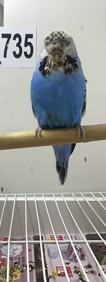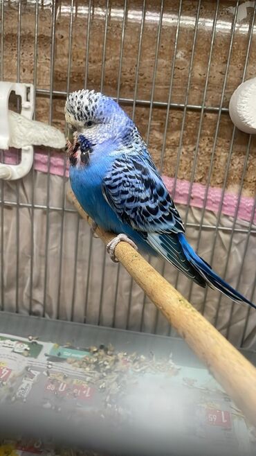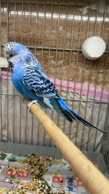 Məhsul: Dalğalı tutuquşu (budağı/əlin üstündə durmağa öyrəşmiş) Təsvir: - Rəng: açıq mavi-mavi gövdə, ağ baş, qara-bənövşəyi ləkəli naxışlar və qanadlarda zolaqlar - Növ: evdə saxlanan dalğalı tut...