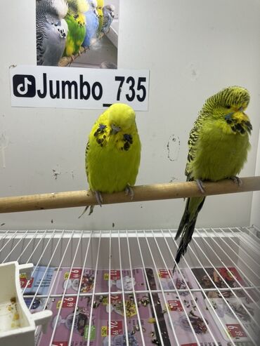 Nömrəli qəfəzdə iki dalğıç papağan (büdcəri) cütü. Xüsusiyyətlər: - Rənglər: biri tam sarı (lutino), digəri yaşıl-sarı, qara zolaqlı baş naxışları və mavi gaga üstü. - Növ: budgerigar (undulat). -...