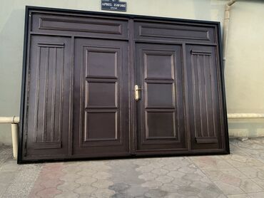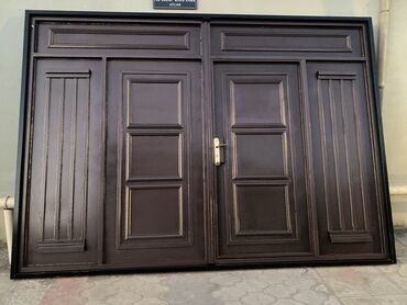 Dekorativ metal darvazalar və giriş qapıları - Material: metaldan hazırlanmış, dekorativ relyef və qızılı ornamentlər, rəngli panellərlə kombinasiya olunmuş dizayn - Komplektlər: 1) İkiqanad dar...