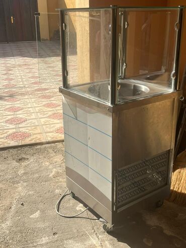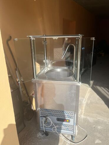 Paslanmayan poladdan hazırlanmış mobil dondurma hazırlama vitrini/standı. Xüsusiyyətlər: - Şaquli şüşə vitrin: məhsulu müştərilərə nümayiş etdirmək və hijyenik qoruma üçün 3 tərəfli şəffaf panel. ...