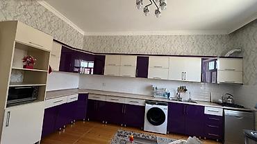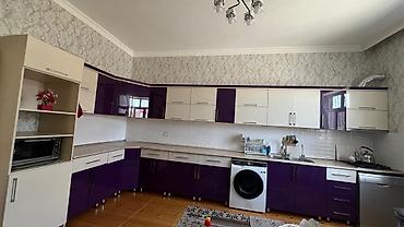 Mətbəx mebeli dəsti - Üst və alt moduldan ibarət funksional mətbəx dəsti - Rəng: yuxarı hissə krem, alt hissə bənövşəyi; orta üstdə güllü dekor panel - Stolüstü: açıq rəngli, hamar səth, asan təmi...