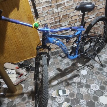 Dağ velosipedi – 26” təkərlər, disk əyləclər, amortizatorlu ön “fork”. - Çərçivə: yüngül və möhkəm alüminium tipli çərçivə, qara rəngdə mavi-qırmızı detallar. - Təkərlər: 26 düym dişli (off-road) ...
