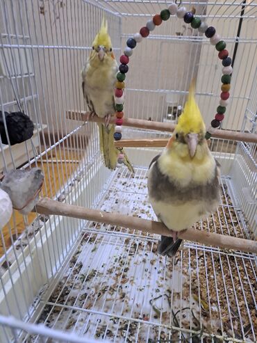 Nimfa (cockatiel) cütü – qəfəslə birlikdə - Növ: Nimfa (Nymphicus hollandicus) – daraqlı, yanaqlarda narıncı ləkəli - Rənglər: biri açıq krem/boz-ağ, digəri piebald/çəhrayı-boz naxışlı - Cüt kimi ...