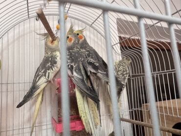 Nymph kakadu (cockatiel) – boz rəngli, yanaqlarında narıncı ləkələr, başında toqqa. Fotoşəkillərdə göstərildiyi kimi ağ-qumlu və qara-boz tonlarda lələklər, uzun quyruq, sarı zolaqlı alt quyruq his...
