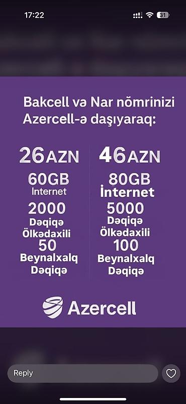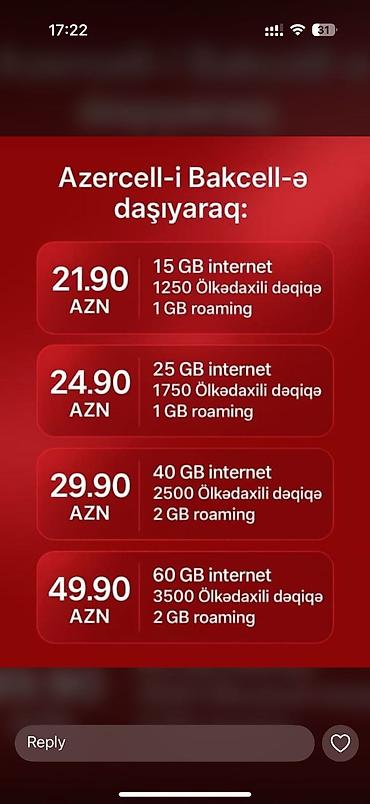Xidmət: Azercell nömrəsini Bakcell-ə daşıyanlar üçün tarif paketləri 17 AZN paket: - 10 GB internet - 750 ölkədaxili dəqiqə - 750 SMS 28 AZN paket: - 60 GB internet - 1500 ölkədaxili dəqiqə - 150...