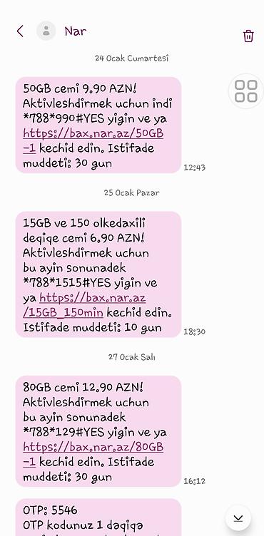 Nar endirimli paketlər (SMS bildirişlərinə əsasən):