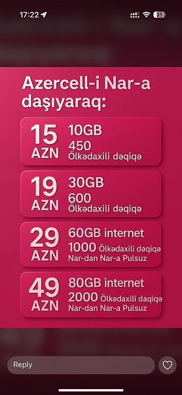 Xidmət: Azercell nömrəsini Nar-a daşıyanlar üçün tarif paketləri - 15 AZN: 10 GB internet + 450 ölkədaxili dəqiqə - 19 AZN: 30 GB internet + 600 ölkədaxili dəqiqə - 29 AZN: 60 GB internet + 1000 ö...