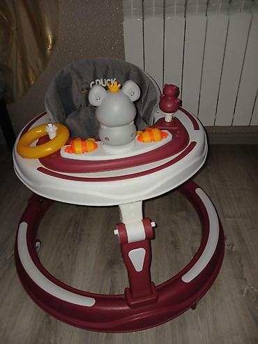 - Yürütəç (walker): Dairəvi baza, qırmızı-ağ rəng gamı. Yumşaq oturacaq, hündürlüyü tənzimlənən konstruksiya. Ön paneldə uşaq üçün əyləncəli elementlər: sükanvari halqa, fiqurlu oyuncaqlar və düymələr. Sabit və enli baza sayəsində balans və hərəkət zamanı dayanıqlıq.
