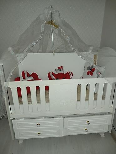 - Beşik: Ağ rəngli, taxta konstruksiyalı beşik. Ön hissəsində şaquli barmaqlıqlar, ortasında şirin ayı naxışı. Üst hissədə uşaq üçün cibin/qəfəslik (tül pərdə) üçün dayaqlı konstruksiya. Beşiyin alt hissəsində 4 ədəd çəkmece (iki cərgə) – paltar və aksesuarların səliqəli saxlanması üçün geniş yer. Yan tərəfi sürüşdürülən qoruyucu panellə təchiz olunub. Daxildə döşək və dekorativ yastıqlar görünür.