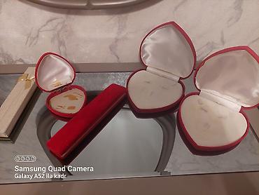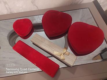 Məxmər üzlüklü, bəzəkli metal tutacaqlı və qızılı küncləri olan dekorativ saxlama qutusu. Qutu qapağında qızılı rəngli naxışlı metal applikasiya var. Daxili hissəsi ipək materialla astarlanmışdır v...