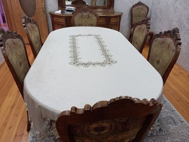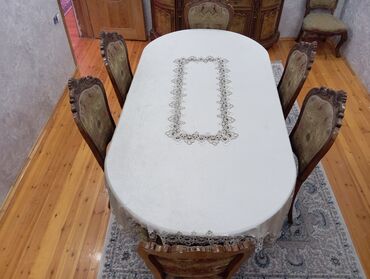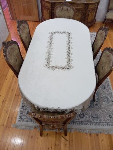 Yemək otağı dəsti: oval formalı masa və 6 ədəd stul birlikdə. - Masa: oval, taxta karkaslı, klassik üslubda; üzərində süfrə ilə göstərilib. - Stullar: 6 ədəd, taxta çərçivə, bel hissəsində dekorat...