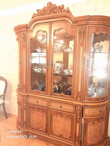 Klassik üslubda böyük vitrin-bufet - Material: təbii ağac (qoz tonlarında), oyma dekor elementləri və intarsiya işləmələri - Ön hissə: üç qanad şüşəli vitrin bölməsi, içəridə güzgülü arxa panel və...