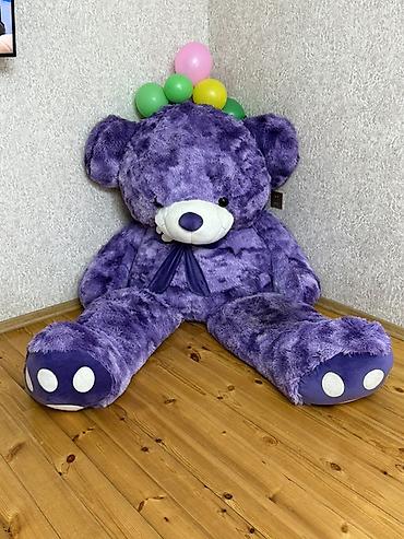 Böyük ölçülü bənövşəyi plyuş ayı oyuncağı - Rəng: bənövşəyi, ağ üz hissəsi və yaşıl-patikli pəncə detalları - Material: yumşaq, tüklü plyuş parça; içliyi sıx və həcmlidir - Üz xüsusiyyətləri: qara...