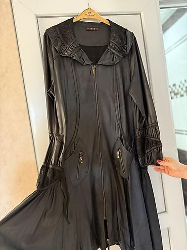 Qara qadın paltosu. Əla vəziyyətdə - Model: kapüşonlu, orta uzunluqda - Rəng: qara - Bağlanma: kəmər bağlaması - Detallar: sinə və qollarda dekorativ dəri effektli zolaqlar - İçlik: hamar atlas t...