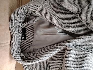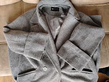 Qadın palto – boz rəng - Model: dizə qədər uzunluq, düz kəsim - Material: qalın yun qarışımlı parça, iç hissəsi qızılı rəngli, diaqonal tikili isti astarlı - Yaxa: yumşaq tüklü/saçaqlı yaxa (eyni b...
