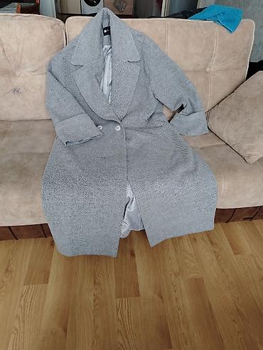 Qadınlar üçün boz rəngli klassik palto - Ölçü: S, M - Model: uzun, düz kəsim; geniş haşiyəli yaxalıq - Rəng: boz - Bağlanma: kəmərli (çıxarılan/parça kəmər) - İçlik: romb naxışlı kapitone (isti sa...
